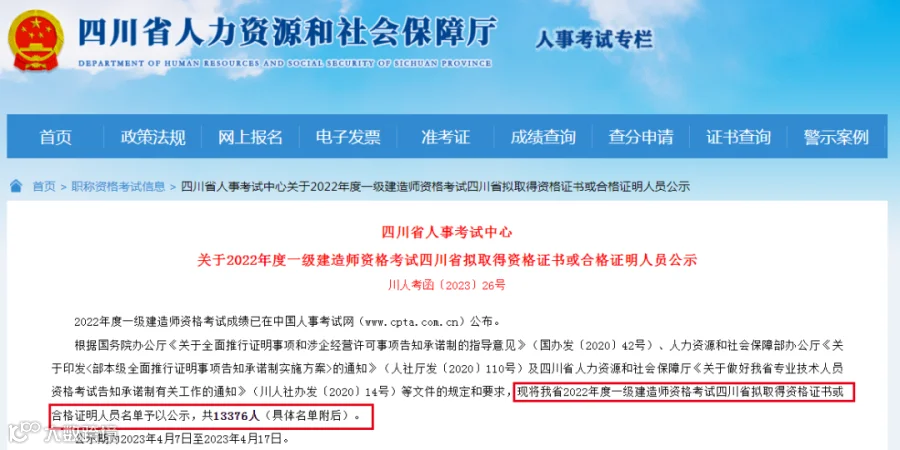 2022年度一级建造师资格考试四川省拟取得资格证书或合格证明人员已公示,共13376人。