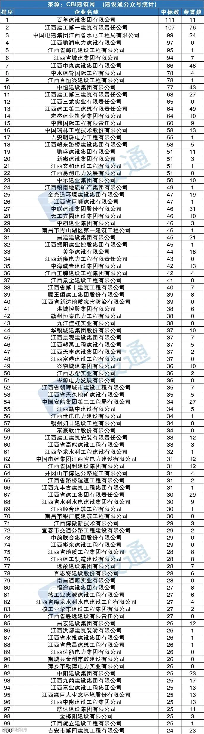 CBI建筑网综合报道:在2022年,江西建筑施工企业中标数量达36065项,同比(与去年同期)上升25.56%。其中,百年建设集团有限公司、江西建工第一建筑有限责任公司、中国电建集团江西省水电工程局有限公司分列中标数量排行榜前三位。