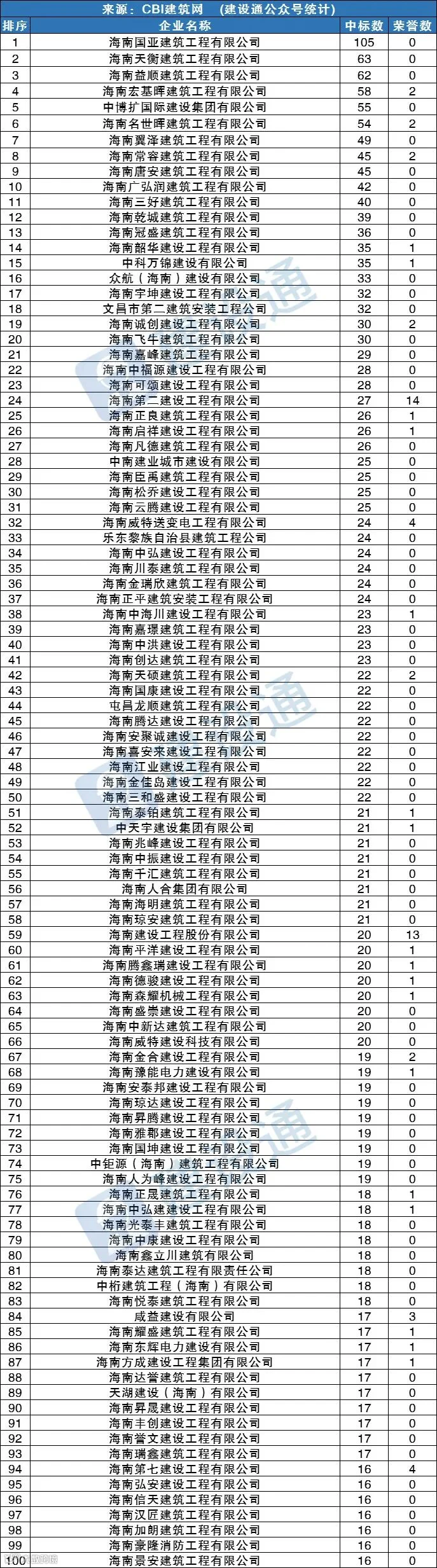 CBI建筑网综合报道:在2022年,海南建筑施工企业中标数量达9786项,同比(与去年同期)上升21.72%。其中,海南国亚建筑工程有限公司、海南天衡建筑工程有限公司、海南益顺建筑工程有限公司分列中标数量排行榜前三位。