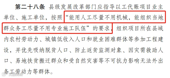 第二十八条提出:能用人工尽量不用机械,能组织当地 群众务工尽量不用专业施工队伍。