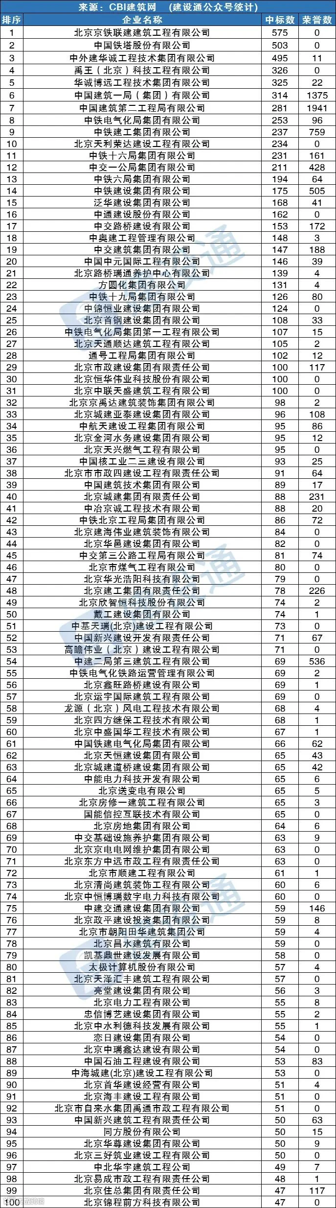 CBI建筑网综合报道:在2022年,北京建筑施工企业中标数量达31718项,同比(与去年同期)上升11.82%。其中,北京京铁联建建筑工程有限公司、中国铁塔股份有限公司、中外建华诚工程技术集团有限公司分列中标数量排行榜前三位。