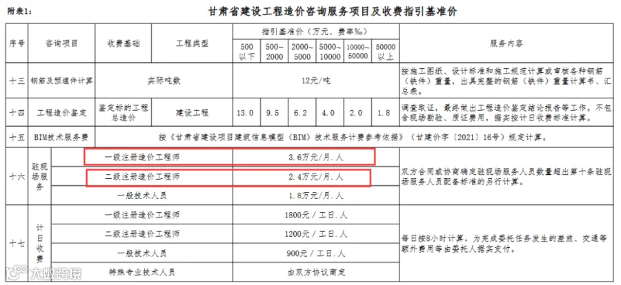 2022年9月3日,甘肃印发《甘肃省建设工程造价咨询服务项目及收费指引(试行)》,其中,对造价工程师收费指引基准价进行了详细规定,