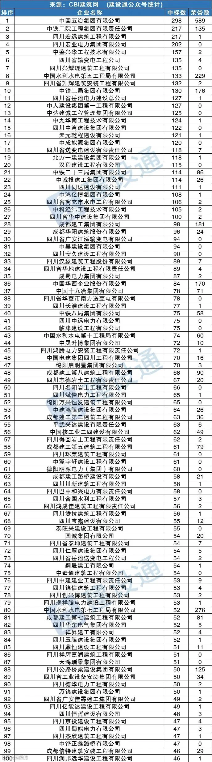 CBI建筑网综合报道:在2022年,四川建筑施工企业中标数量达69775项,同比(与去年同期)上升23.16%。其中,中国五冶集团有限公司、中铁二院工程集团有限责任公司、四川宏远建筑工程有限公司分列中标数量排行榜前三位。