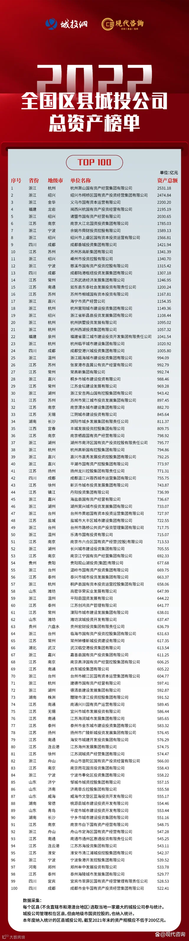该榜单由城投网和江苏现代资产投资管理顾问有限公司发布。现代咨询集团董事长丁伯康告诉第一财经,预计未来百强榜门槛会进一步提高,这也体现了整个区县级城投公司的发展趋势,就是资产规模和业务收入的增加明显,转型的动力和压力越来越大。