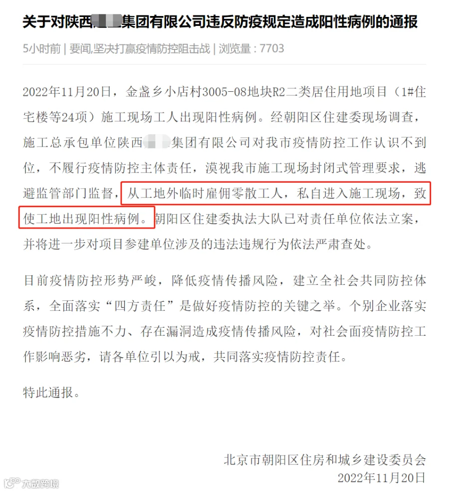 日前,北京市朝阳区住建委发布了关于《关于对陕西XX集团有限公司违反防疫规定造成阳性病例的通报》。