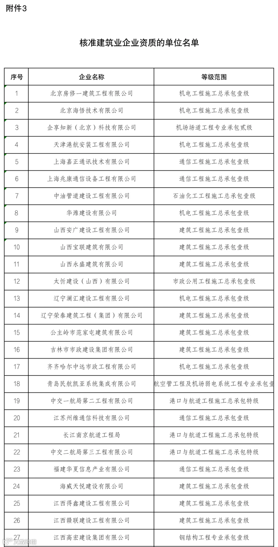 3.核准建筑业企业资质的单位名单