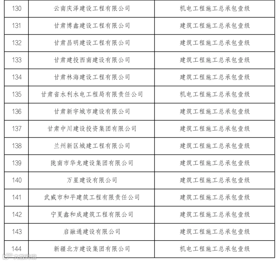 施工资质公告:144家企业,144项资质(其中港口与航道工程施工总承包特级3家,建筑工程施工总承包一级106家,机电工程施工总承包一级17家)