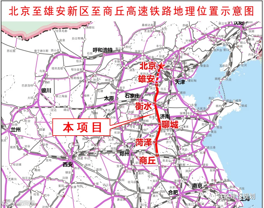 新建北京至雄安新区至商丘高速铁路雄安新区至商丘段是京港台通道的重要组成部分,线路位于京沪高速铁路、京广客运专线两大干线之间,基本沿既有京九通道,线路北起京雄城际铁路雄安站,经河北省雄安新区、沧州市、衡水市、邢台市,山东省聊城市,河南省濮阳市,山东省济宁市、菏泽市至河南省商丘市,接入商合杭高铁商丘站,正线全长552.5km。