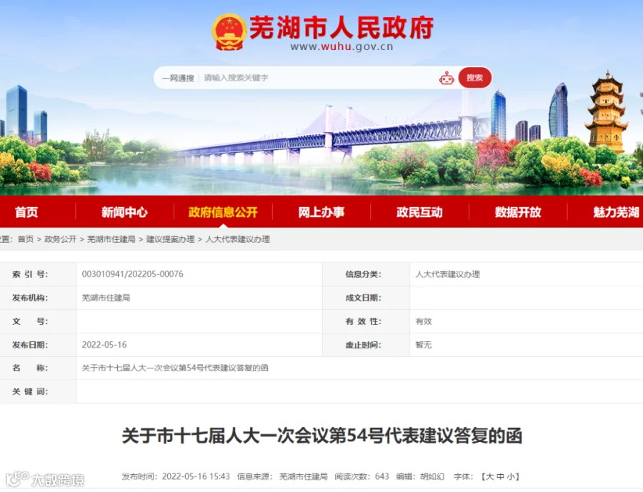 5月16日,安徽省芜湖市人民政府发布《关于市十七届人大一次会议第54号代表建议答复的函》,该函是芜湖市住建局回复芜湖市一位人大代表在芜湖市十七届人大一次会议期间提出的《关于扶持本地建筑施工企业资质等级升级的建议》。