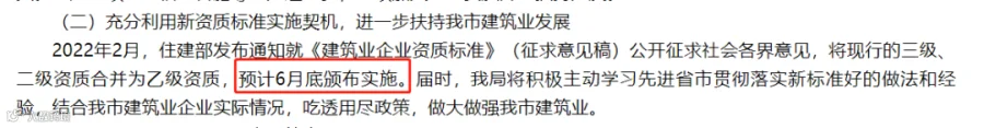 从最新的官方消息来看,新的《建筑业企业资质标准》预计6月底颁布实施。