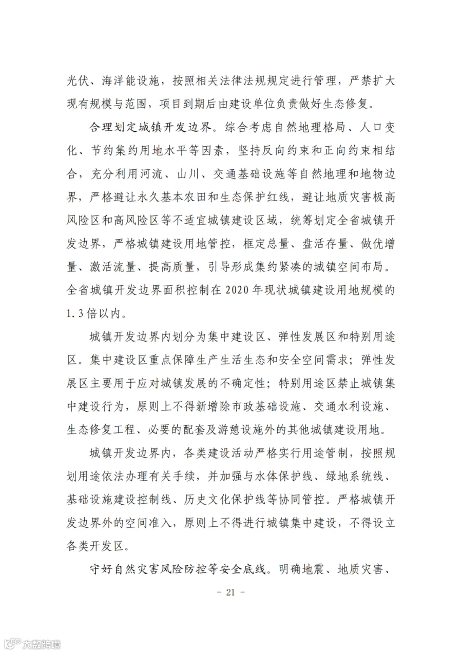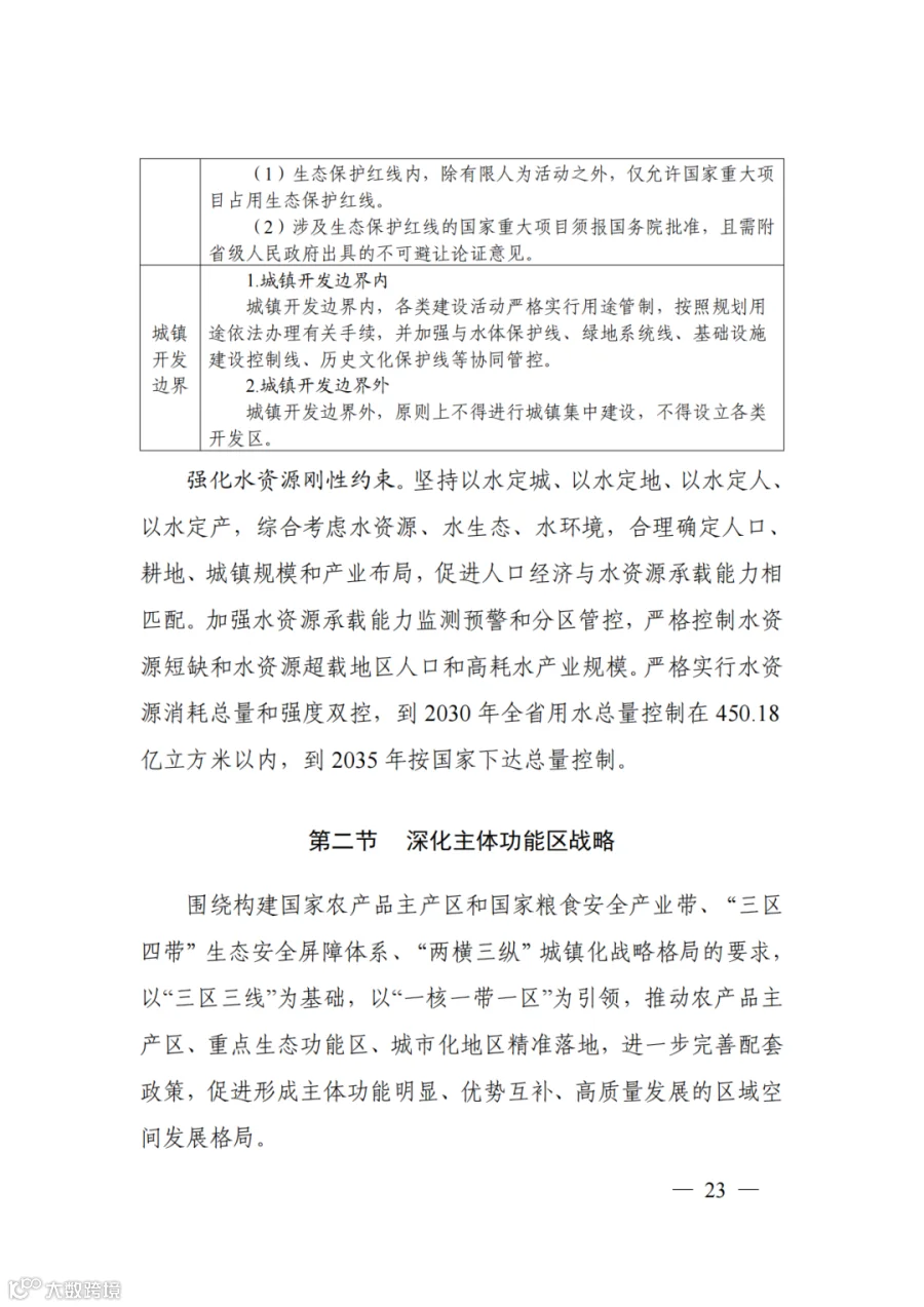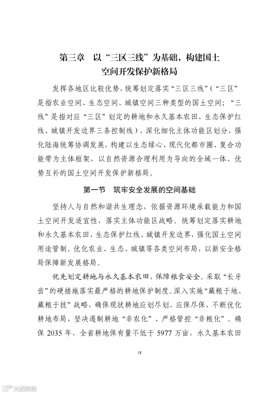 二、筑牢安全发展的空间基础。到2035年,浙江省耕地保有量不低于1876.00万亩,其中永久基本农田保护面积不低于1652.00万亩;生态保护红线面积不低于3.67万平方千米,其中海洋生态保护红线面积不低于1.46万平方千米;城镇开发边界扩展倍数控制在基于2020年城镇建设用地规模的1.3倍以内;单位国内生产总值建设用地使用面积下降不少于40%;用水总量不超过国家下达指标,其中2025年不超过186.8亿立方米。明确自然灾害风险重点防控区域,划定洪涝等风险控制线,落实战略性矿产资源、历史文化保护等安全保障空间,全面锚固高质量发展的空间底线。