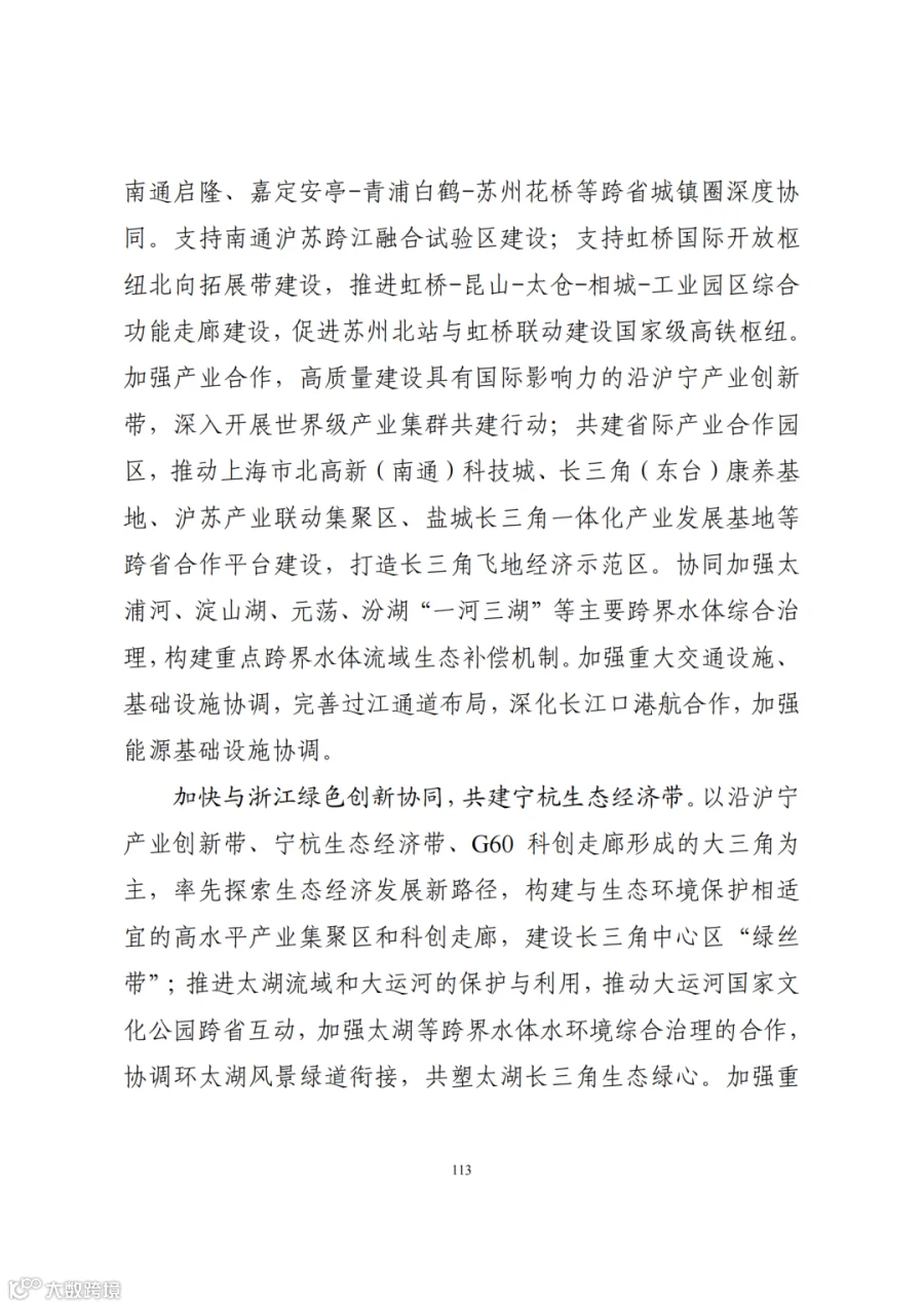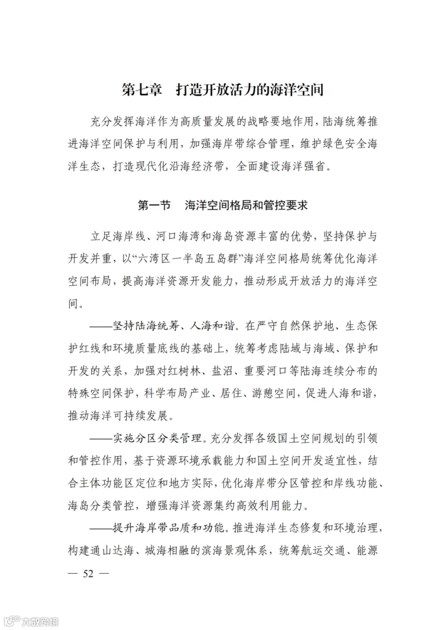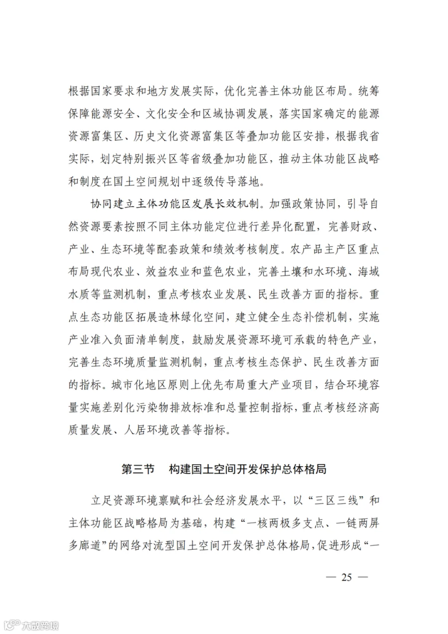 三、构建支撑新发展格局的国土空间体系。深入实施区域协调发展战略、区域重大战略、主体功能区战略、新型城镇化战略、乡村振兴战略,促进形成主体功能明显、优势互补、高质量发展的国土空间开发保护新格局。深度融入长江经济带发展、长三角一体化发展战略,共同将长三角打造成为率先基本实现现代化引领区和改革开放新高地,加强与京津冀协同发展、粤港澳大湾区建设协调布局,加快海洋强省建设,高质量共建“一带一路”,推进更高起点更高层次对外开放。
