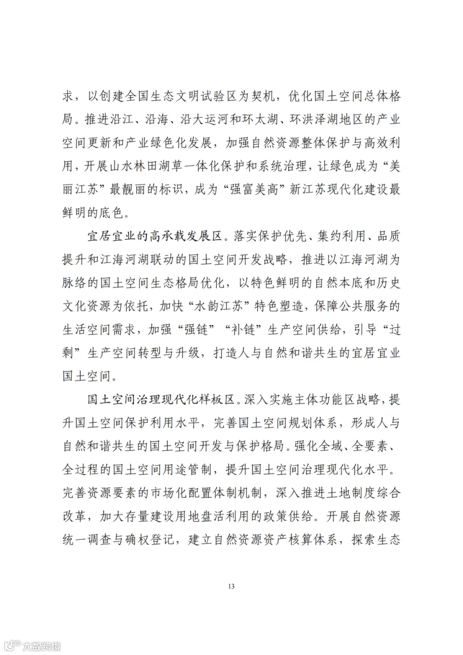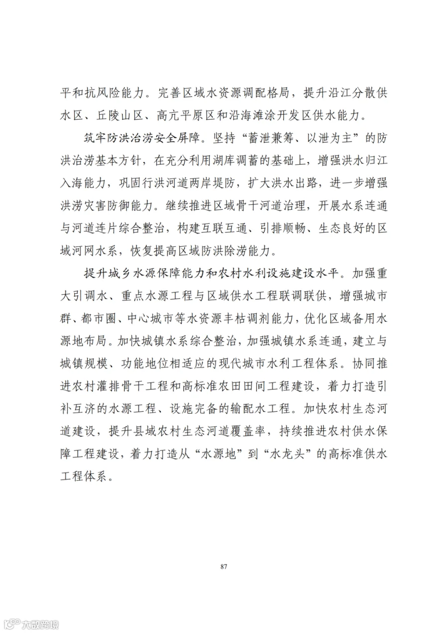 四、系统优化国土空间开发保护格局。发挥区域比较优势,优化主体功能定位,细化主体功能区划分,完善差别化支持政策。集中保护和建设杭嘉湖平原等粮食主产区,在高度城镇化地区大力发展现代都市农业,完善浙西南特色农产品优势区布局,强化浙东沿海、舟山群岛等特色渔业建设,形成绿色多元的特色农产品生产空间。系统推进环太湖流域、杭州湾、舟山群岛等生态保护修复,严格实施钱塘江、瓯江等重要水域岸线空间保护,加强水资源战略储备。推进长三角生态绿色一体化发展示范区建设,以杭州、宁波都市圈为重点,大中小城市和小城镇为支撑,构建多中心、网络化、集约型、开放式、绿色化的区域一体空间布局,持续深化“千村示范、万村整治”工程,打造城乡生活圈,均衡布局公共服务设施,体现江南鱼米之乡、山水浙江的风采特色,打造中国式农业农村现代化的浙江样板。布局战略性新兴产业、未来产业发展空间,抓住产业数字化、数字产业化赋予的机遇,构建现代化经济体系,将宁波舟山港努力打造为世界一流强港。完善城市和区域灾害风险防控设施布局,合理布局应急保障设施,健全综合防灾减灾安全保障体系。统筹传统和新型基础设施空间布局,构建现代化基础设施网络。强化文化遗产与自然遗产整体保护和系统活化利用,健全文化遗产与自然遗产空间保护机制,加强杭州西湖文化景观、大运河、良渚古城遗址等世界遗产保护,构建文化资源、自然资源、景观资源整体保护的空间体系,把生态效益更好转化为经济效益、社会效益,推进浙江生态文明建设迈上新台阶,彰显诗画浙江的独特魅力。