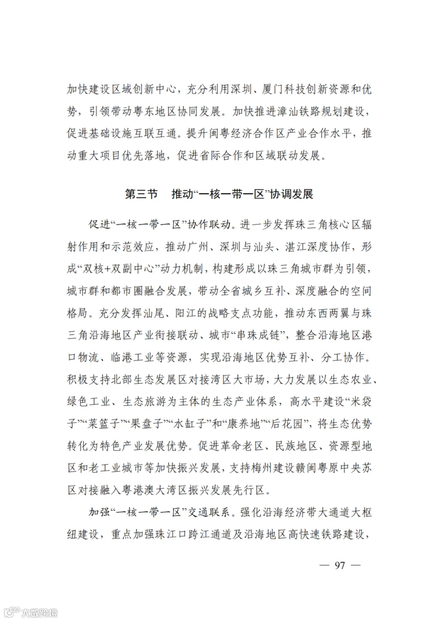 “一核”即强化珠三角核心引领带动作用,深化珠江口东西两岸融合发展,支撑广州、深圳都市圈和珠中江一体化发展,携手港澳共建国际一流湾区和世界一流城市群,形成带动全省发展的主动力源。