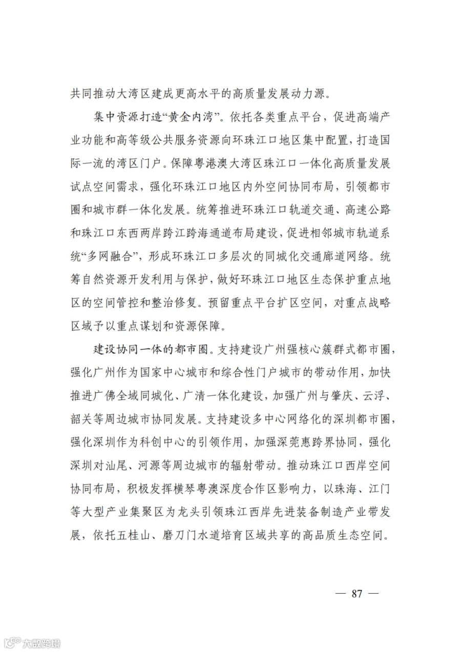 统筹推进环珠江口轨道交通、高速公路和珠江口东西两岸跨江跨海通道布局建设,促进相邻城市轨道系统“多网融合”,形成环珠江口多层次的同城化交通廊道网络。