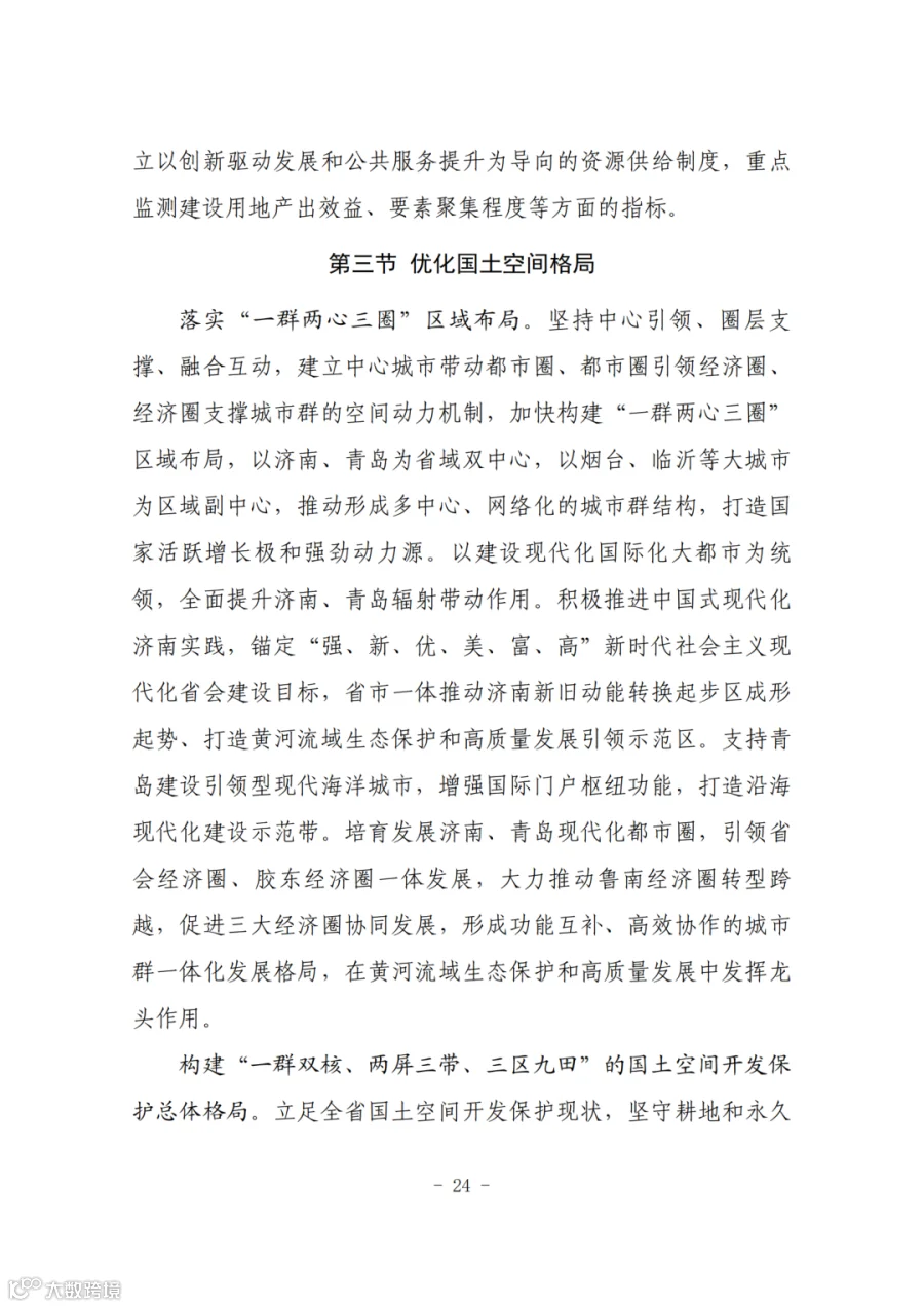 三、构建支撑新发展格局的国土空间体系。深入实施区域协调发展战略、区域重大战略、主体功能区战略、新型城镇化战略和乡村振兴战略,促进形成主体功能明显、优势互补、高质量发展的国土空间开发保护新格局。加强哈长城市群与辽中南、山东半岛城市群协调联动,推进与京津冀协同发展等重大区域发展战略对接合作,积极参与中蒙俄经济走廊建设,打造好我国向北开放的重要窗口和东北亚地区合作中心枢纽,推动东北全面振兴取得新突破。