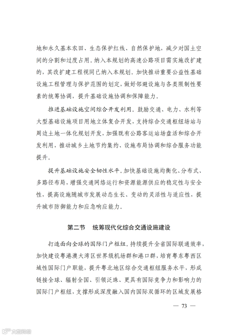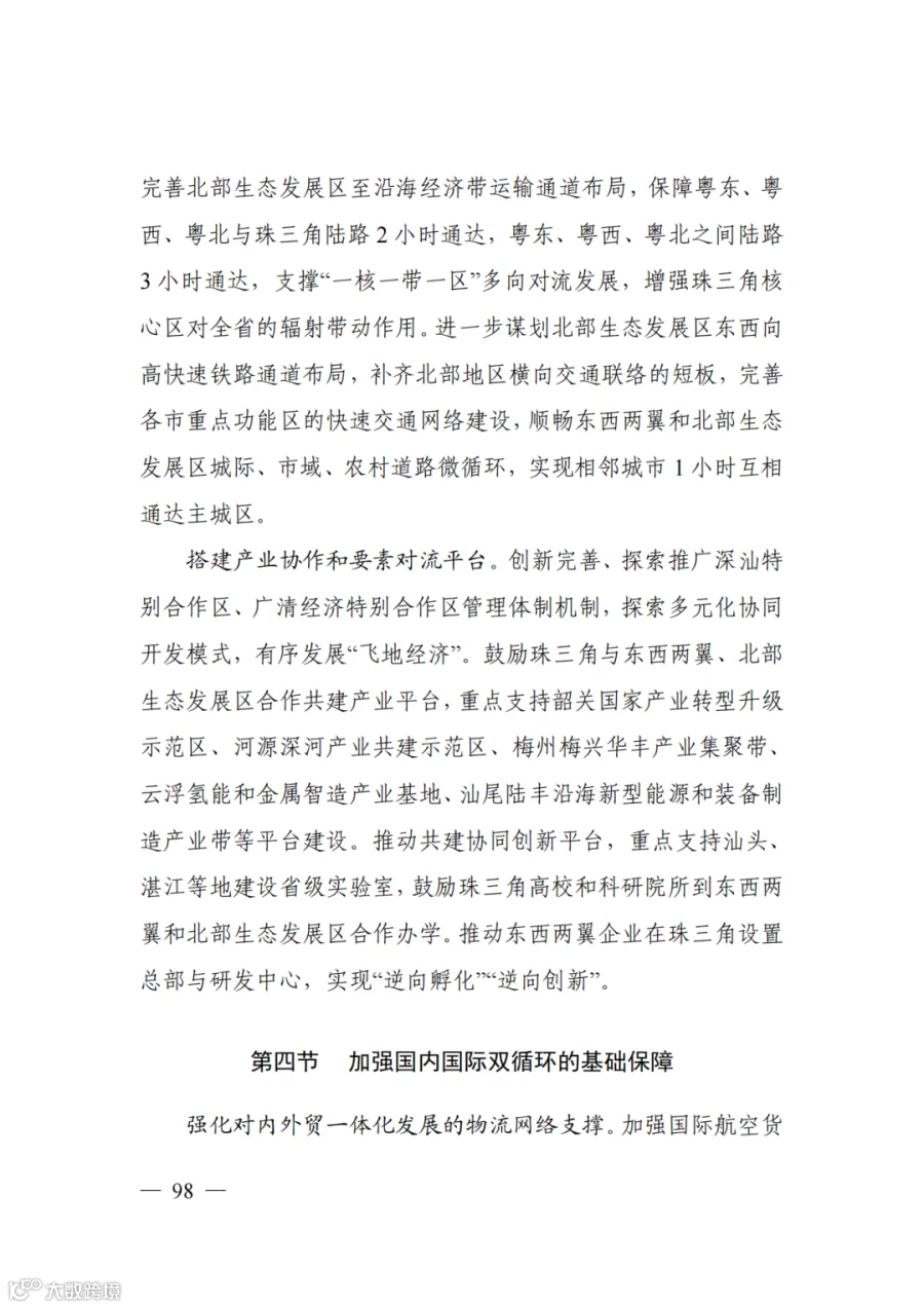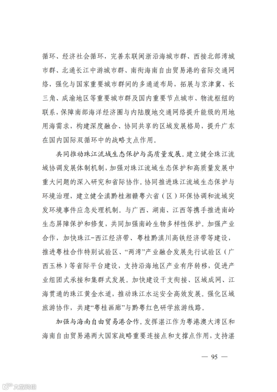 着眼畅通产业循环、市场循环、经济社会循环,完善东联闽浙沿海城市群、西接北部湾城市群、北通长江中游城市群、南衔海南自由贸易港的省际交通网络,强化与国家重要城市群间的多通道布局,拓展与京津冀、长三角、成渝地区等重要城市群及国内重要节点城市、物流枢纽的联系,保障南部海洋经济圈与内陆腹地交通网络提升能级的用地用海需求,构建深度融合、协同共享的区域发展格局,提升广东在国内国际双循环中的战略支点作用。