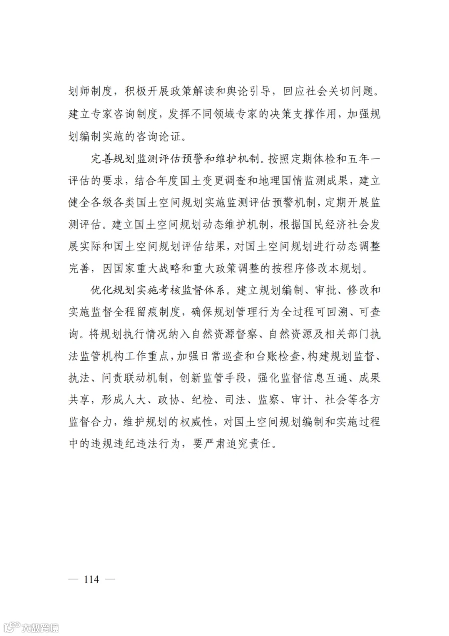 五、维护规划严肃性权威性。《规划》是对浙江省国土空间作出的全局安排,是省域国土空间保护、开发、利用、修复的政策和总纲,必须严格执行,任何部门和个人不得随意修改、违规变更。按照定期体检和五年一评估的要求,健全各级各类国土空间规划实施监测评估预警机制,将规划评估结果作为规划实施监督考核的重要依据。建立健全规划监督、执法、问责联动机制,实施规划全生命周期管理。