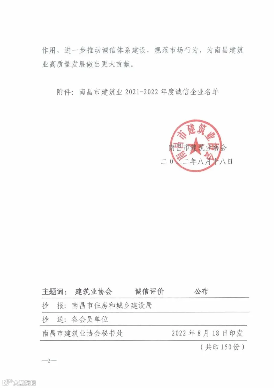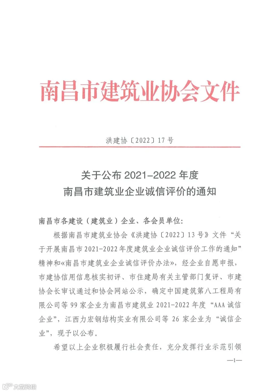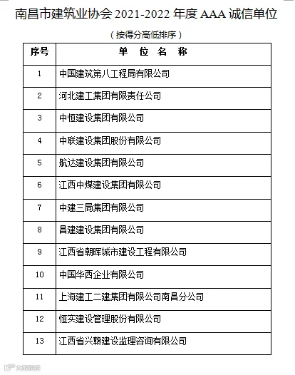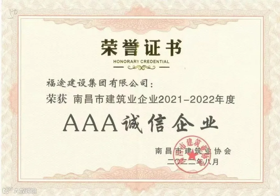 近日,南昌市建筑业协会公布了《关于公布2021-2022年度南昌市建筑业企业诚信评价的通知》,福途建设集团再次被评定为市级“AAA诚信企业”,反映了公司拥有良好的企业经营效益、信用状况和合同管理体系,体现了政府监管部门和广大客户对我司在依法经营、诚信履约、社会信誉方面的肯定和认可。