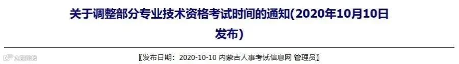 2020年10月10日,内蒙古发布二建考试调整通知,明确表示2020年内蒙古二级建造师考试时间调整为12月5日至6日举行,准考证打印时间为11月30日-12月5日。