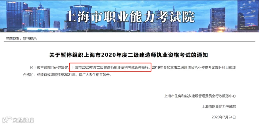 2020年7月24日,上海市住建委发布通知,暂停2020年二级建造师执业资格考试。