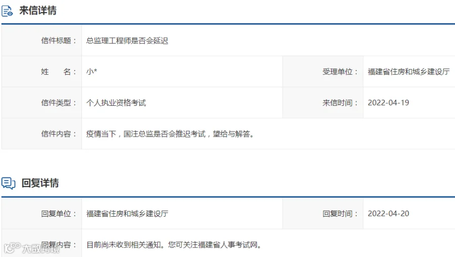 4月19日,有网友在福建省住建厅留言:疫情当下,国注总监是否会推迟考试,望给与解答。