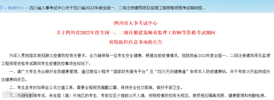4月20日,四川省人事考试中心发布了关于四川省2022年度全国一、二级注册建筑师及监理工程师等资格考试期间疫情防控注意事项的公告。公告明确: