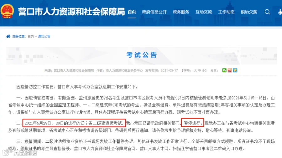 根据本市新冠肺炎疫情防控工作有关要求,经上级主管部门研究决定,原计划于2022年6月11日、6月12日举行的本市二级建造师执业资格考试暂停实施。2021年度参加本市二级建造师执业资格考试已取得的合格成绩有效期相应延长一年。