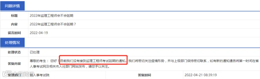 4月19日,有人在安徽省人社厅留言咨询:2022年监理工程师会不会延期?