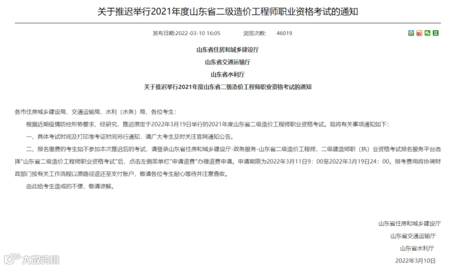 早在三月份,山东就曾发布通知:受疫情影响,二造考试再次推迟。