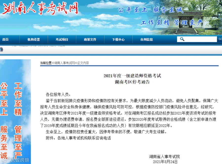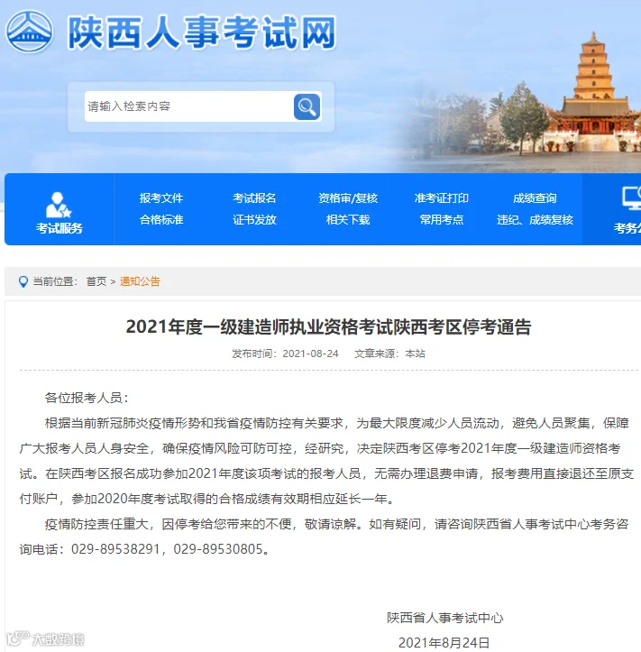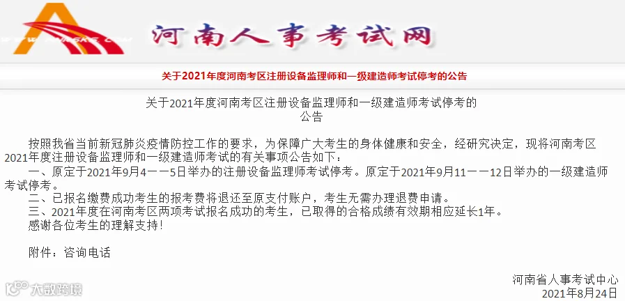 2020年8月12日,北京市人社局、人事考试中心下发通知,取消2020年度一级建造师、二级建造师、全国监理工程师、一级造价工程师、一级注册消防工程师等考试,均并入2021年度统一组织。