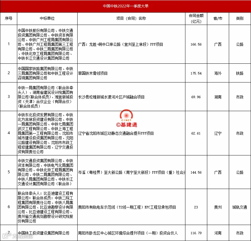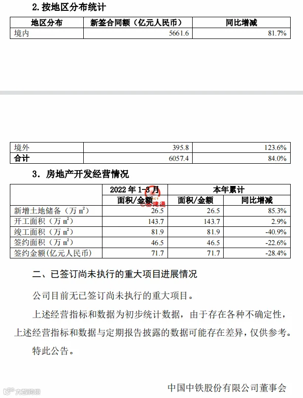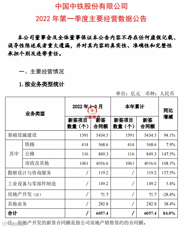 刚刚,中国中铁公布2022年一季度经营情况: