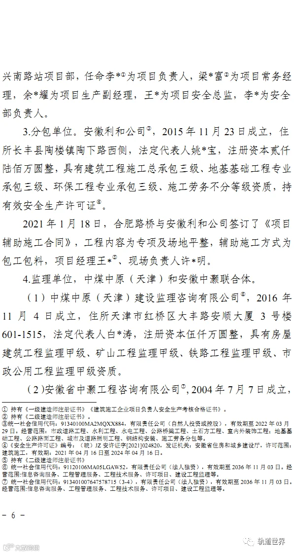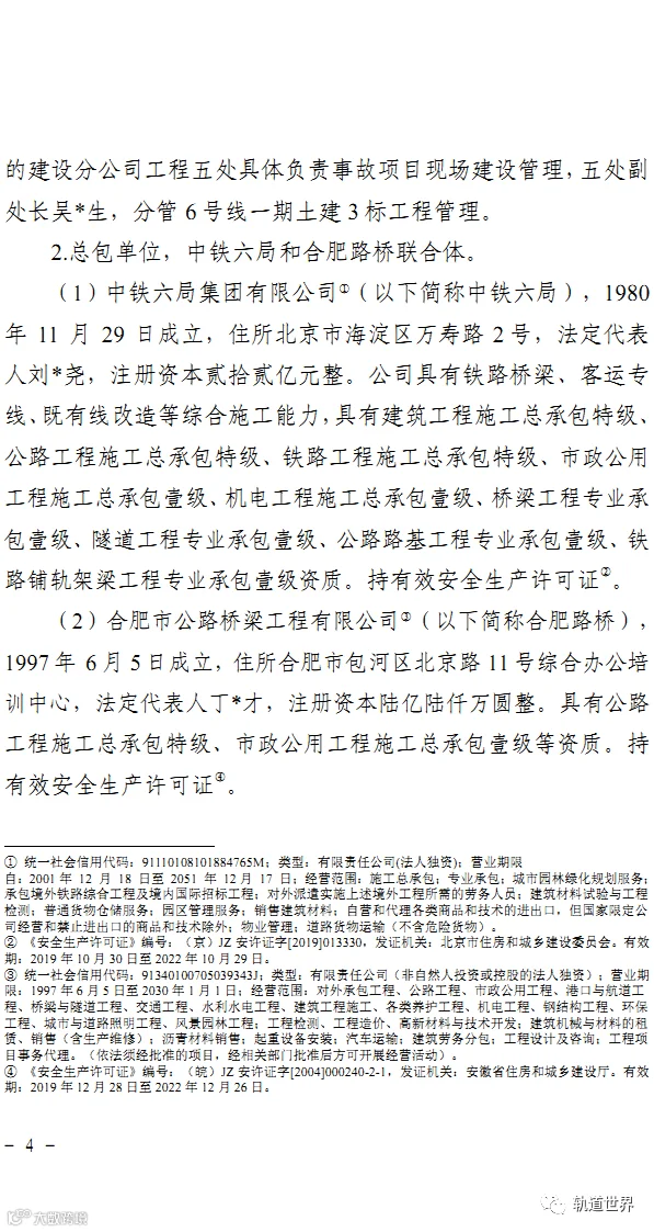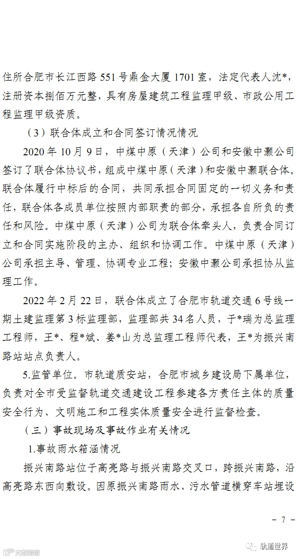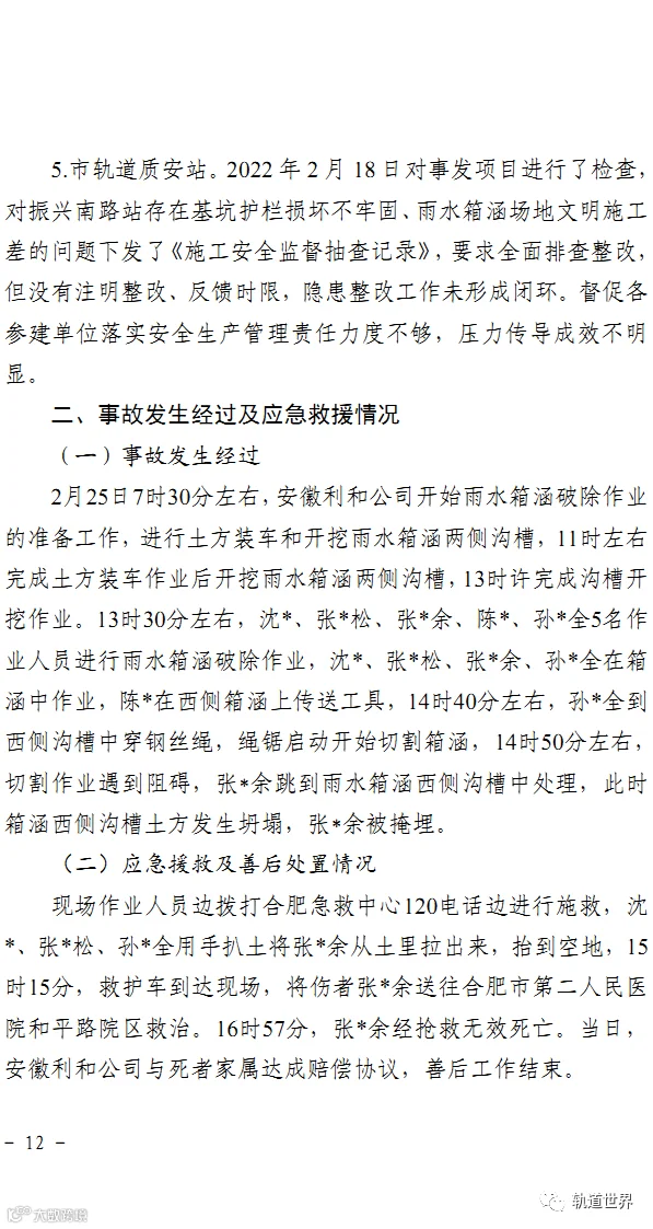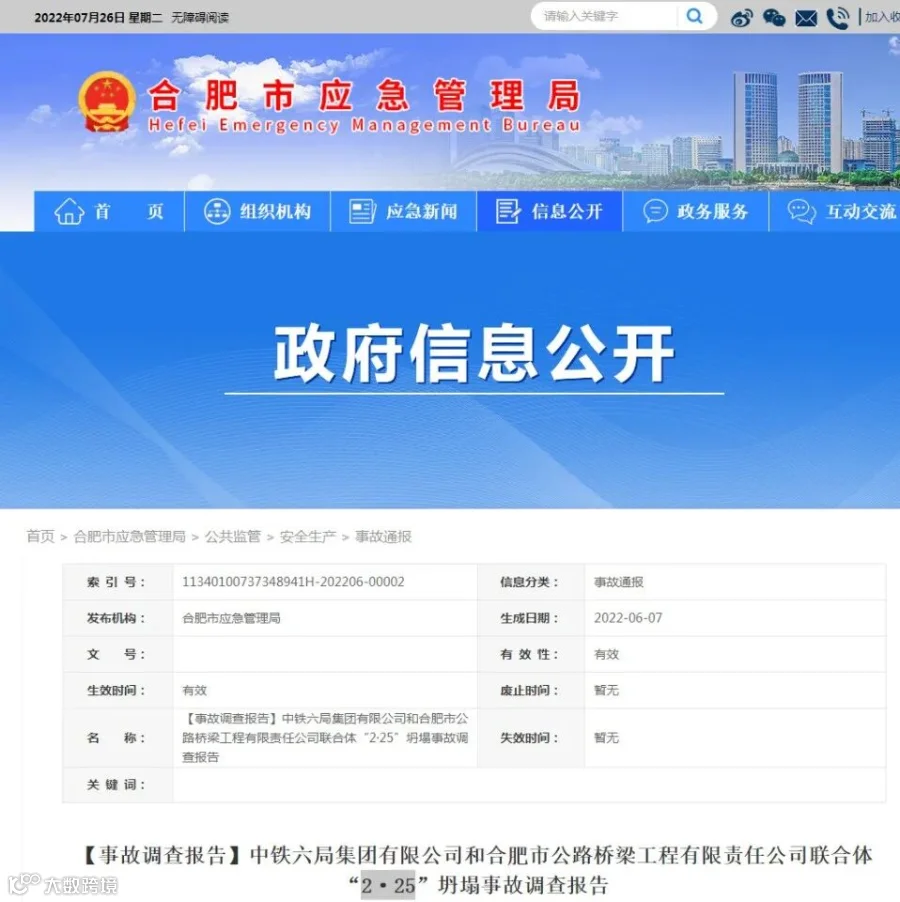 2022年2月25日14时50分左右,中铁六局集团有限公司和合肥市公路桥梁工程有限责任公司联合体(简称中铁六局和合肥路桥联合体)承建的合肥市轨道交通 6号线一期土建施工总承包3标项目的振兴路站雨水箱涵破除施工时,发生一起沟槽坍塌事故,造成 1人死亡。