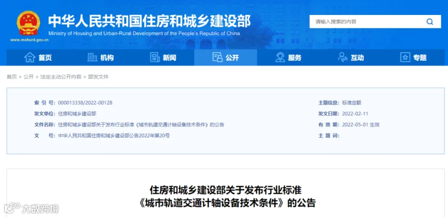 现批准《城市轨道交通计轴设备技术条件》为城乡建设行业产品标准,编号为CJ/T543-2022,自2022年5月1日起实施。