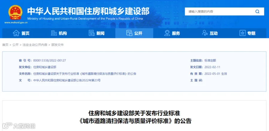 现批准《城市道路清扫保洁与质量评价标准》为行业标准,编号为CJJ/T126-2022,自2022年5月1日起实施。原行业标准《城市道路清扫保洁质量与评价标准》(CJJ/T126-2008)同时废止。