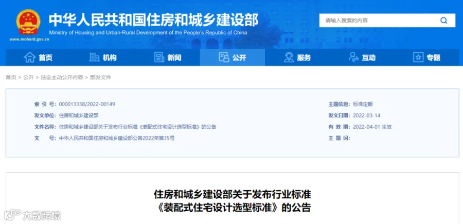 现批准《装配式住宅设计选型标准》为行业标准,编号为JGJ/T494-2022,自2022年4月1日起实施。