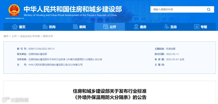 现批准《外墙外保温用防火分隔条》为建筑工业行业产品标准,编号为JG/T577-2022,自2022年5月1日起实施。