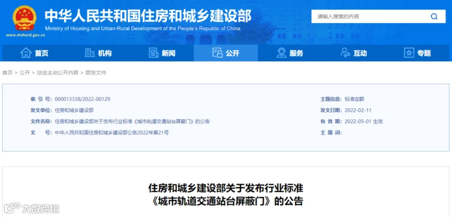 现批准《城市轨道交通站台屏蔽门》为城乡建设行业产品标准,编号为CJ/T236-2022,自2022年5月1日起实施。原《城市轨道交通站台屏蔽门》(CJ/T236-2006)同时废止。
