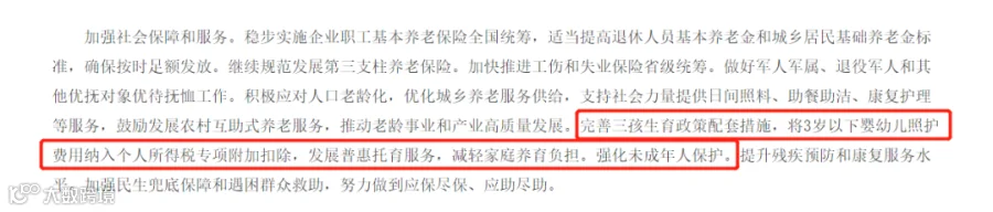 完善三孩生育政策配套措施,将3岁以下婴幼儿照护费用纳入个人所得税专项附加扣除,发展普惠托育服务,减轻家庭养育负担。强化未成年人保护。提升残疾预防和康复服务水平。加强民生兜底保障和遇困群众救助,努力做到应保尽保、应助尽助。