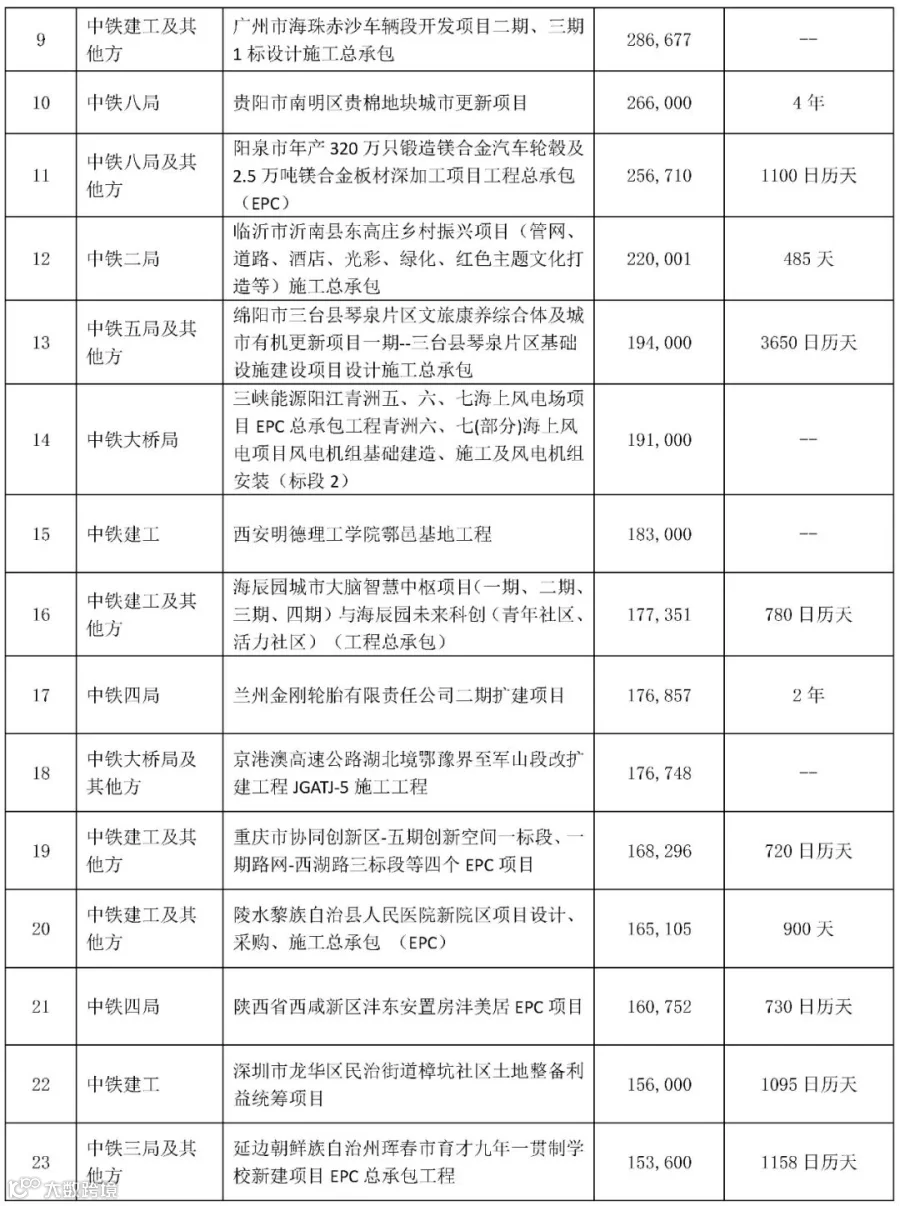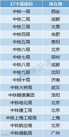 注:中铁一至五局为原铁道部工程局,为综合局;中铁六至十局为2004年配合铁道部主辅分离新组建的,为综合局;大桥局、电化局、隧道集团、航空港、港航局,为专业局;但目前也慢慢走向综合化。