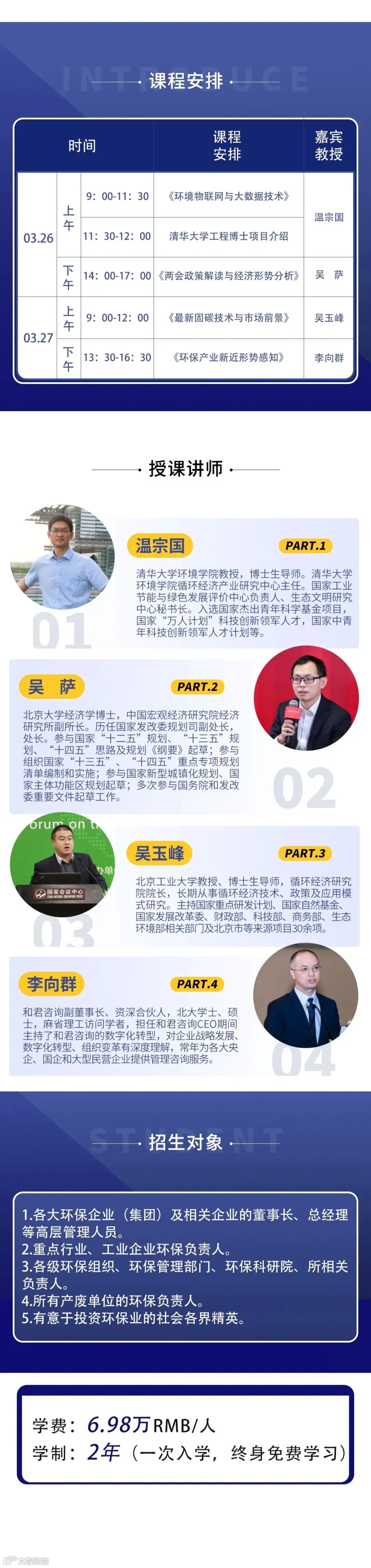 针对性课程体系(宏观经济、政策解读、环保新技术、双碳目标、企业管理等),案例教学