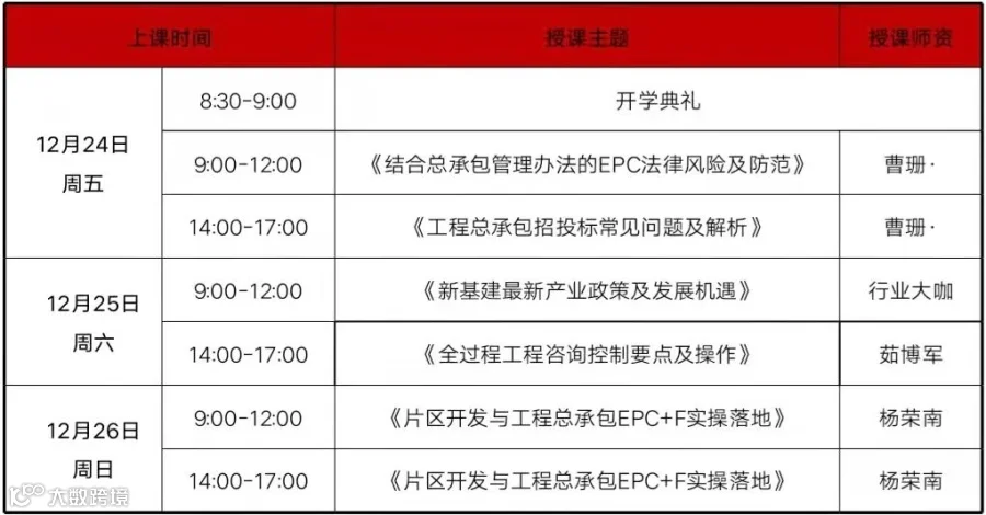 各位同学,您好!《新基建下EPC工程总承包与全过程工程咨询实战型高级研讨班 第63期》,定于2021年12月24日-26日杭州市开课。请您合理安排时间,提前联络教务老师,按时上课。