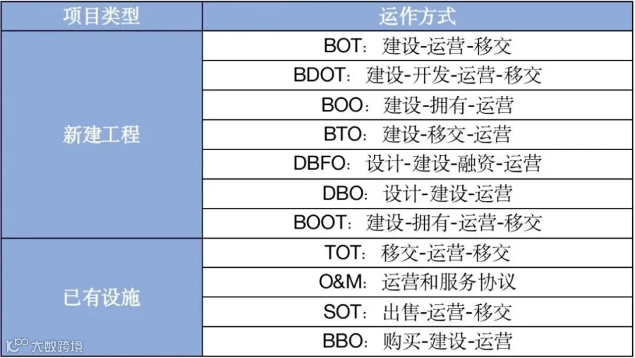 综上所述,PPP的概念无论从广义或狭义上讲,范围都要比BOT、TOT等要广,BOT、BDOT、BOO、BTO、DBFO、DBO、BOOT、TOT、O&M、SOT、BBO等都可以看作是PPP模式的一种运行模式。