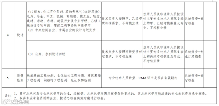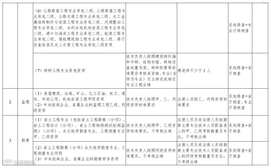 (一)建筑业企业资质:(1)技术负责人,其中:对各类别最低等级资质,还需核查技术负责人(或注册建造师)业绩是否满足资质标准要求。(2)注册建造师数量。