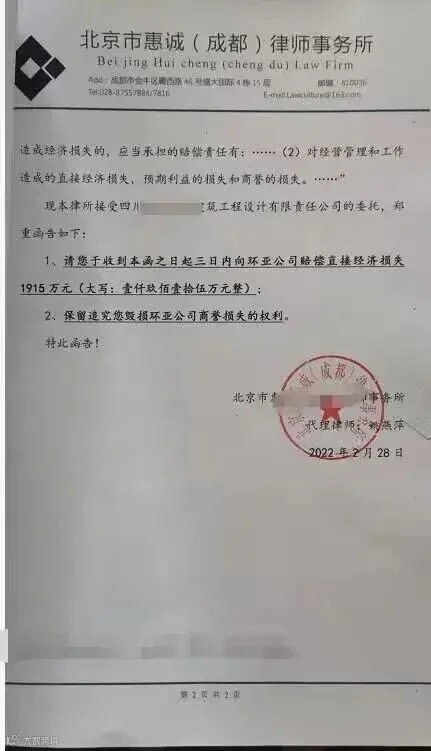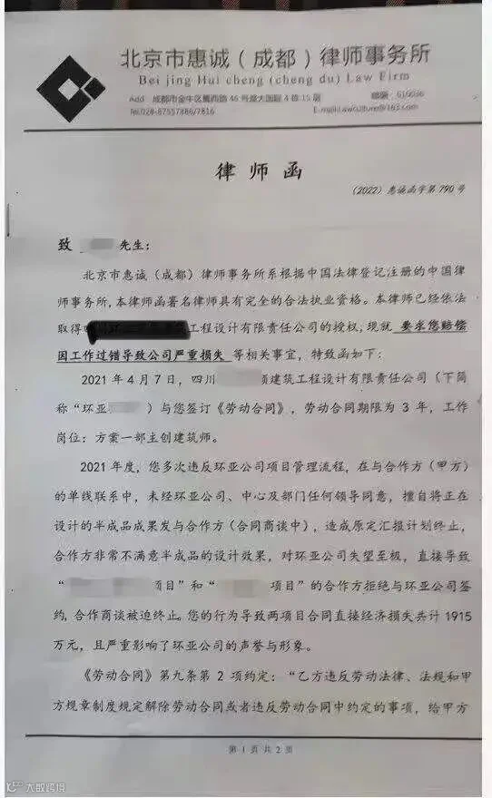 看样子现在设计院的工作也不好做了,看了律师函全文其实也大概明白了,设计师私下和甲方保持了单线联系,设计师的设计成果未经公司认可就直接发给了甲方,然而甲方非常不认可此设计成果,进而对此设计公司的整体业务水平产生了怀疑,最后终止了两个项目的合作商谈,产生了直接经济损失1900多万元!
