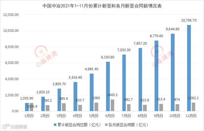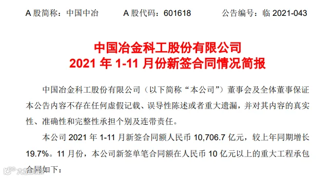 今日,中国冶金科工股份有限公司(简称“中国中冶”)发布了最新企业公告,中国中冶 2021 年 1-11 月累计完成新签合同额人民币 10706.7 亿元,同比增长率 19.7%。企业经营业绩正式迈进万亿俱乐部!