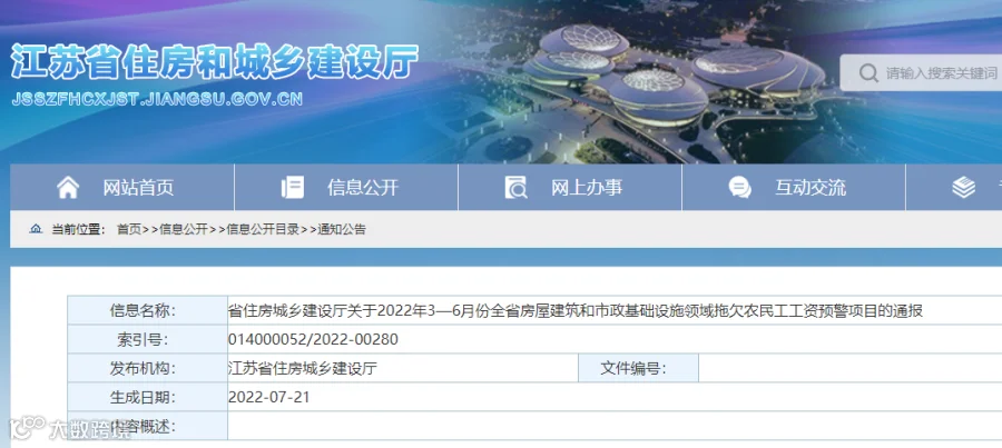 近日,江苏省住建厅发布《关于2022年3—6月份全省房屋建筑和市政基础设施领域拖欠农民工工资预警项目的通报》,主要存在以下问题: