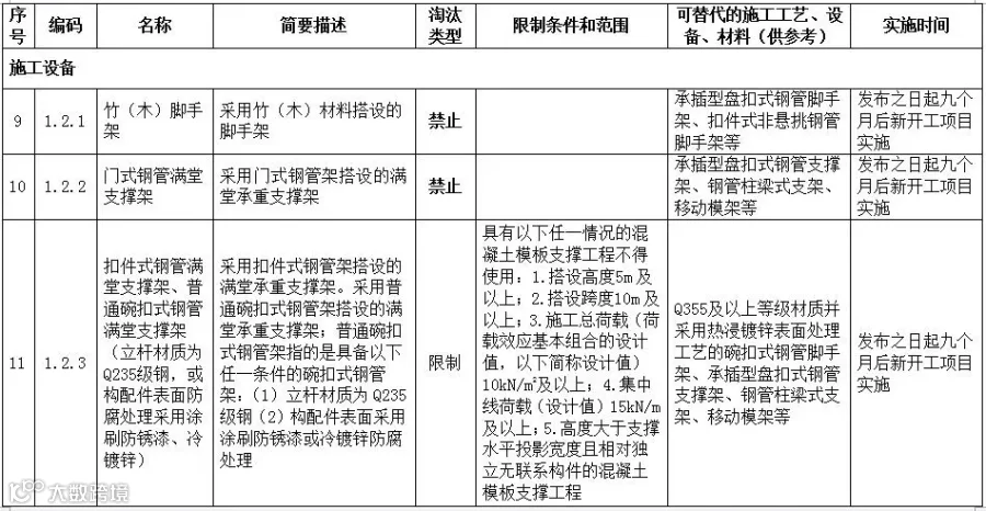 备注:(一)发布之日起9个月后,全面停止在新开工项目中使用本《目录》所列禁止类施工工艺、设备和材料。