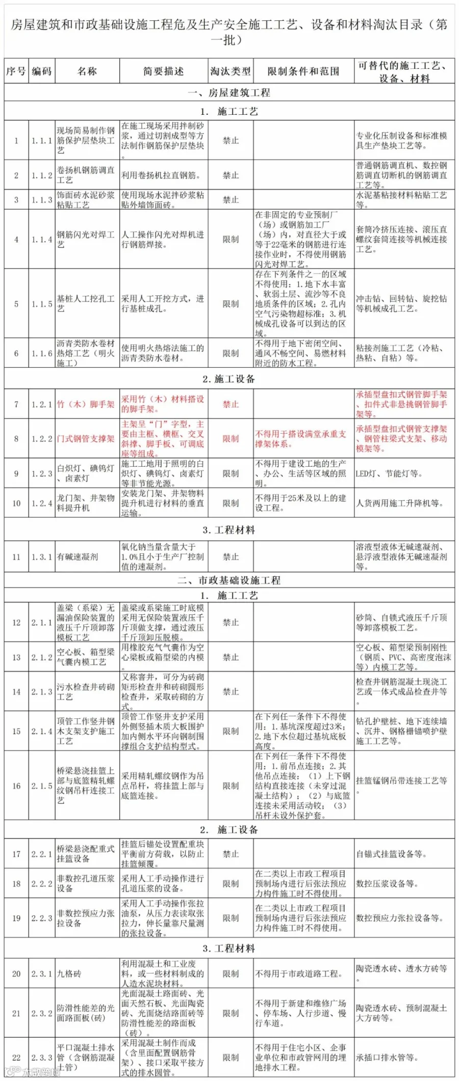 刚刚,住房和城乡建设部正式发布《房屋建筑和市政基础设施工程危及生产安全施工工艺、设备和材料淘汰目录(第一批)》的公告。