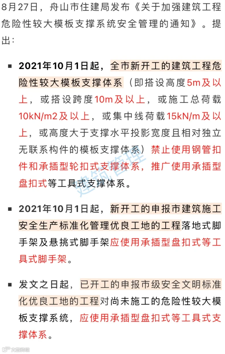浙江舟山:2021年10月1日起,全市新开工的建筑工程危险性较大模板支撑体系禁止使用钢管扣件和承插型轮扣式支撑体系,推广使用承插型盘扣式等工具式支撑体系。